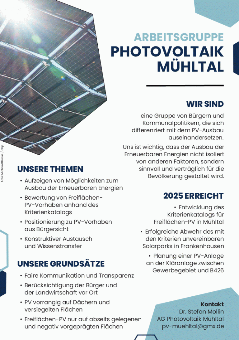 Website der AG Photovoltaik online: Auf pv-muehltal.de informieren wir über unsere Aktivitäten, Neuigkeiten und Kandidaten zur Kommunalwahl 2026.