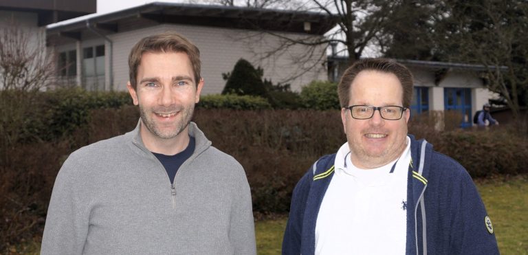 Gemeinsam für den PV-Ausbau in Mühltal: Dr. Stefan Mollin, Vorsitzender der AG Photovoltaik Mühltal (links) und Boris Scherf, Aufsichtsratsmitglied der Energiegenossenschaft Darmstadt. Foto: Nikos Vormwald.